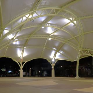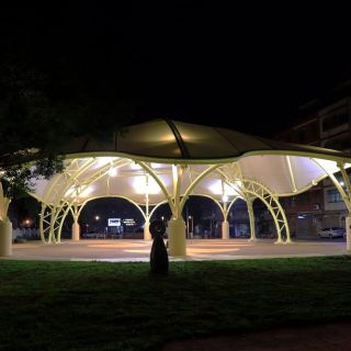 八德藝文廣場興建天幕,並增加照明設備,有別於光線直接往下投射造成刺眼,使用天幕的弧度和白色帆布,將光源平均安置在支架中央與四處,投射於天幕上,營造出協和氣氛,而周邊則使用高照明度的高燈,除了更襯托出天幕的美,亦提供安全度高的照明。